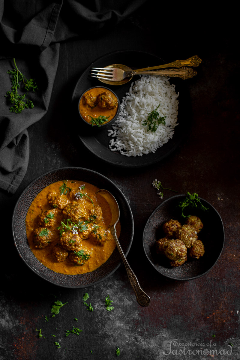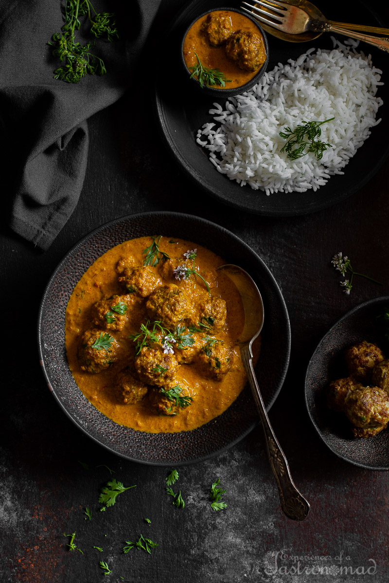 Ball Curry. Meatballs in a mild tomato-onion gravy. Spiked with ginger. Pacified with coconut milk. Finished with fresh coriander leaves