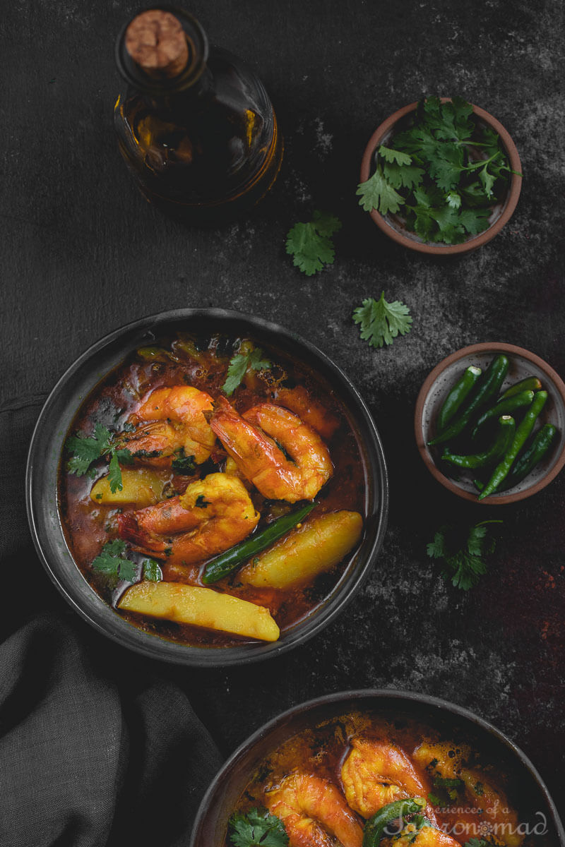 And even before I revert from my reverie, I have thrown into the pressure cooker a handful of potatoes (need I remind you yet again of the love of us Bengalis for the starchy tuber ?), enough onions to instigate my lacrimal glands to a feverish overdrive, a melange of succulent tomatoes, carelessly quartered, an explosion of green chillies and a fragrant profusion of coriander leaves and shoots. And the prawns of course. Finished with a hedonistic splash of mustard oil.
