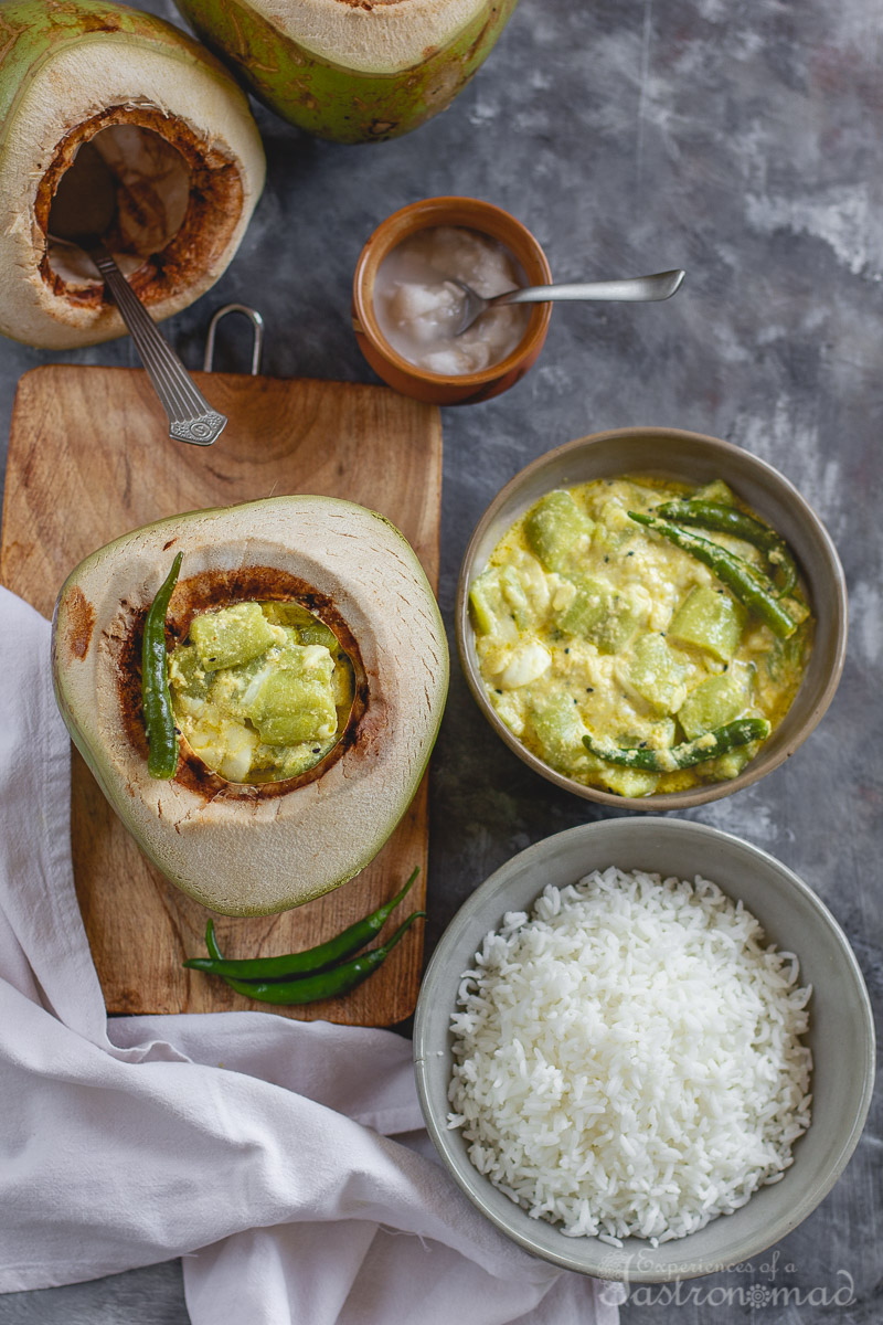 The waiter, in his late teens, maybe early twenties, reminds me with a grin, Madam please scrape the inside of the coconut shell lightly and stir the coconut flesh into the curry.