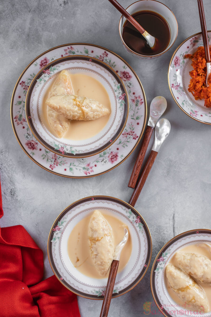 Gajorer Doodhpuli. Rice dumplings stuffed with a delectable mixture of red carrots, jaggery and raisins (and yes the measly amount of scraped coconut that was left behind). Added to reduced milk, languorously stewed over a low flame, perfumed with the magic of nolen gur.