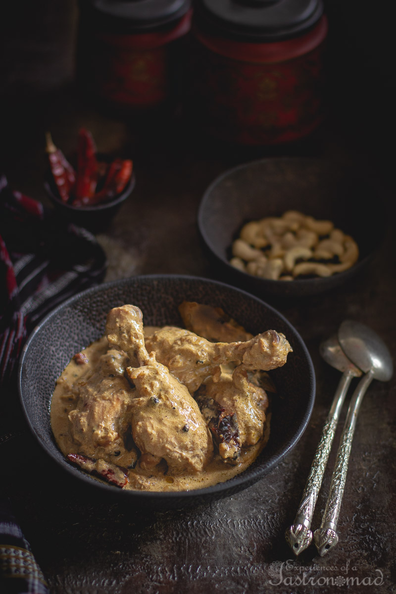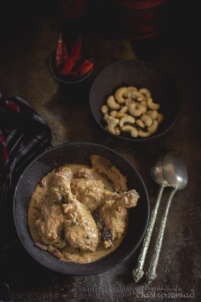 - When the chicken is about three-fourths cooked, stir in the cashew nut paste and freshly crushed black pepper powder. Mix well, add 1/4 cup of warm water. Cover and cook over a medium flame, stirring occasionally, till the chicken is done.
