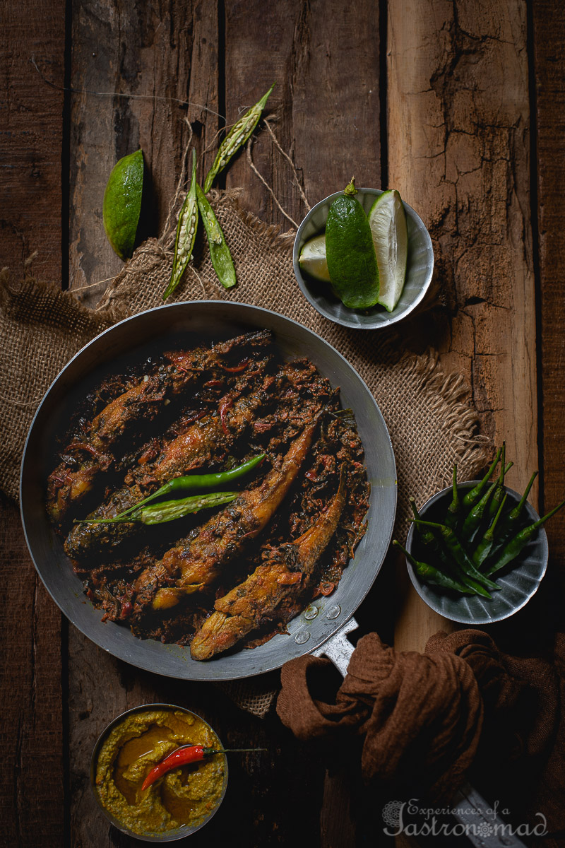 But yet another of my childhood favorites – laal shaak diye bele maach. The gorgeous red amaranth paired with bele maach, a delicious fresh-water fish ubiquitous in rural Bengal and Assam. Perfumed with kalonji. A touch of onion. A hint of garlic. A generous helping of posto bata (poppy seed paste) spiked with fiendish green chillies. Earthy and unpretentious, yet finger licking delicious.