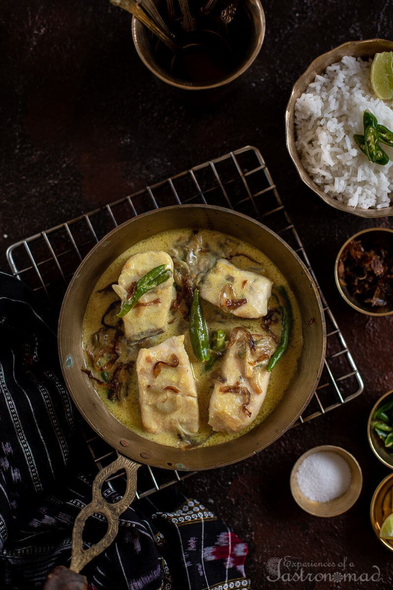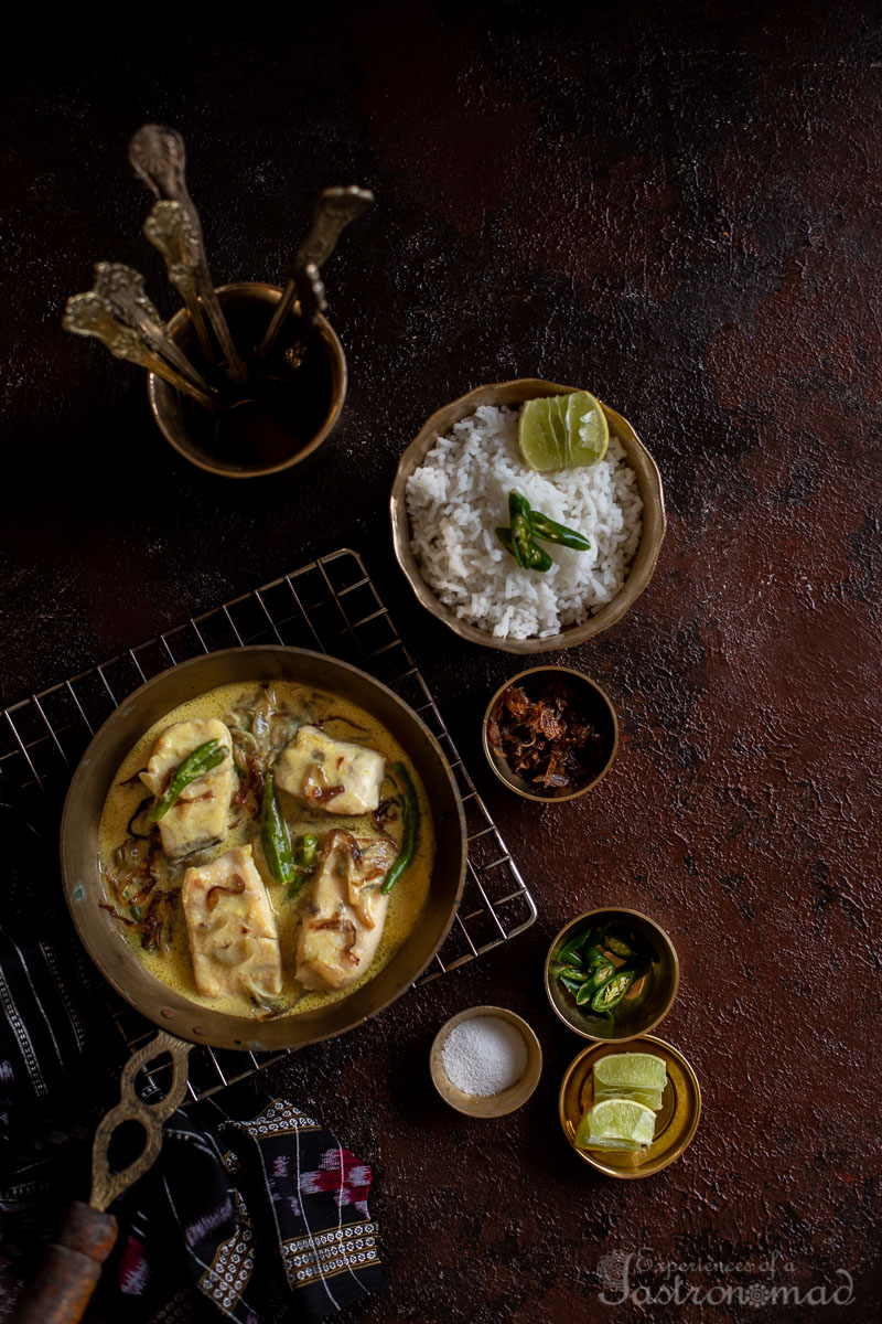 This time its narkel bhetki, bhetki slices cooked in coconut milk perfumed with ginger. And yes, those sinful caramelized onions that accentuate the earthy sweetness of coconut milk.