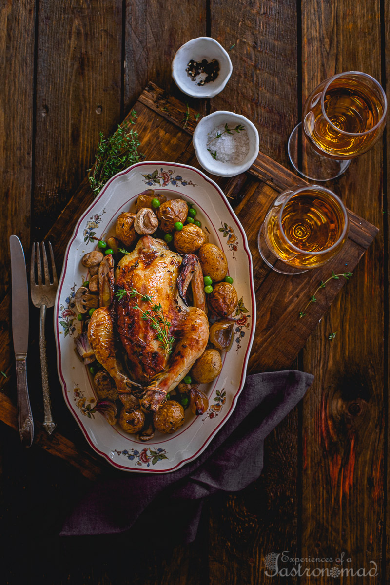 Roast Chicken. The Anglo-Indian way. Luscious and succulent. Winter veggies in tow. And a pan sauce flavoured with garlic and thyme to tie it all together.