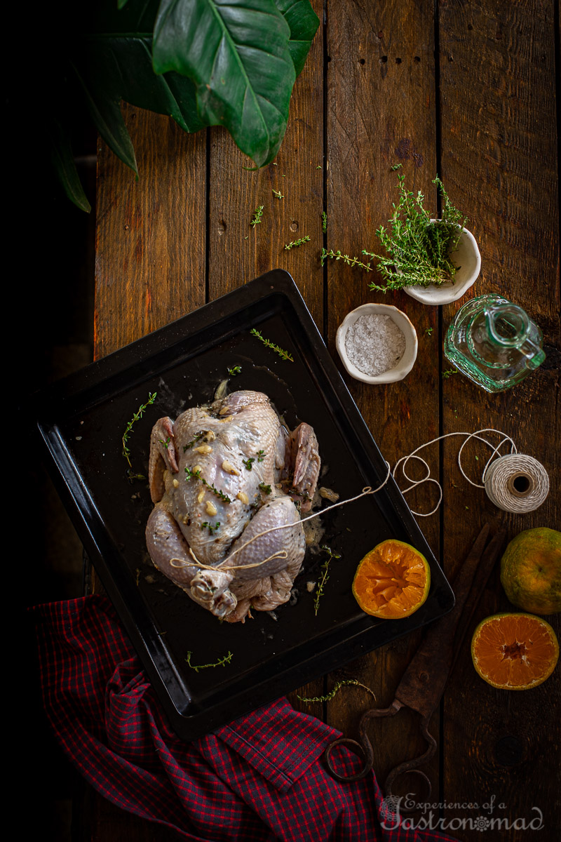 - Place the orange halves inside the cavity of the chicken, seal the cavity with toothpicks.